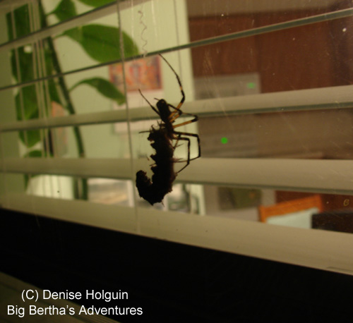 This spider set up its new home along the corner of my dining room window. It worked out great because I’d come home and open the blinds. As I sat and ate dinner I could watch the spider having its dinner.