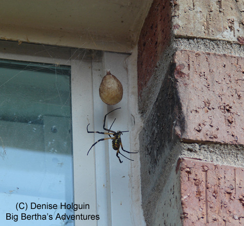 Every summer there’s a well-fed spider… there’s also an egg sack!