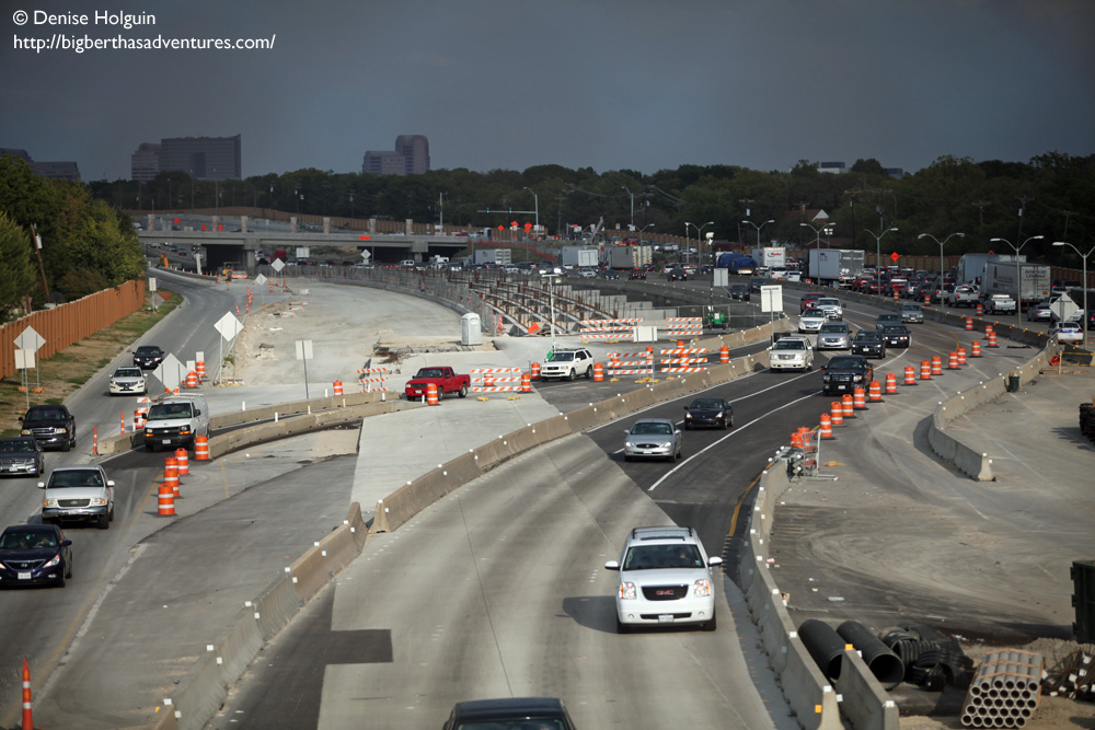 Here’s a look at traffic going Westbound on 635. Take a look at the old and new concrete. I opted for a larger photo so you can get a better view of the construction and the chaos. Click on the photo for a larger view.