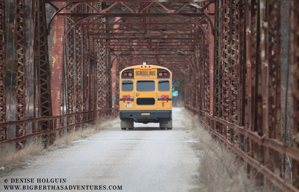 Then a school bus approached and slowed down.  There clearly wasn’t enough room for the three of us on the bridge.  We got out of the way, smiled and waved.  The bus driver waved back at us.