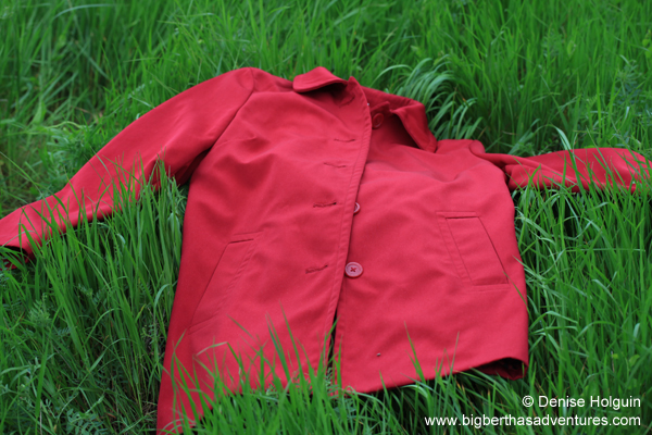 Along the journey I approached another grassy area. I debated on placing my new bag on the grass. So I sacrificed my raincoat. The day was cloudy – which meant colors would especially pop for the camera – as we see with the red and green below.