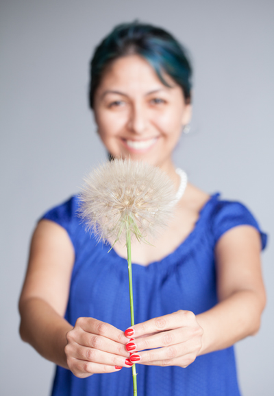 I really wanted to show scale—and unfortunately, I couldn’t find any normal sized dandelions among the weeds. So I took the ‘giant dandelion’ inside the studio and asked our photographer, Steve Woods to take a photo with me in the background.