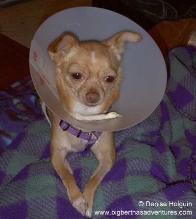Eventually the flying leap exercises were detrimental to Kibbles’ physical health.  Early in her life she developed a problem in her knee.  Her hind leg would get stuck.  My parents paid for the surgery – it was expensive and it was uncomfortable for Kibbles – who had to wear a cone around her neck until her leg healed.  But that investment was worth it – Kibbles recovered and was able to enjoy a good quality of life.