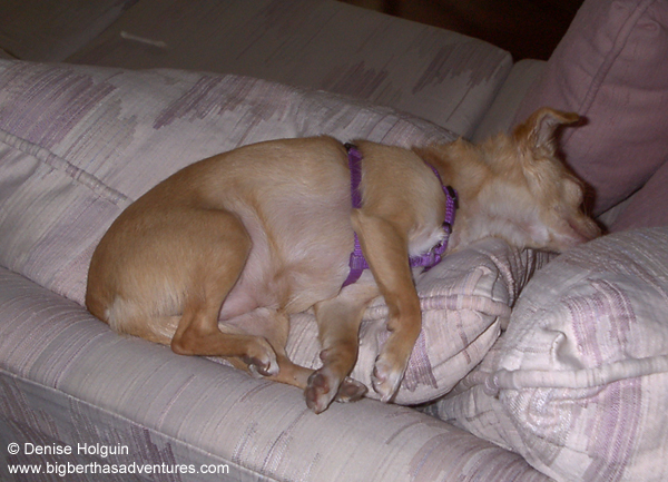 As a pup, Kibbles enjoyed many activities, including taking flying leaps from the sofa.  She wasn’t allowed on the sofa but eventually we gave up.  She also enjoyed perching on top of a pillow cushion to nap.  You could always tell that Kibbles had been sitting on the pillow, the pillow had conformed to her shape.