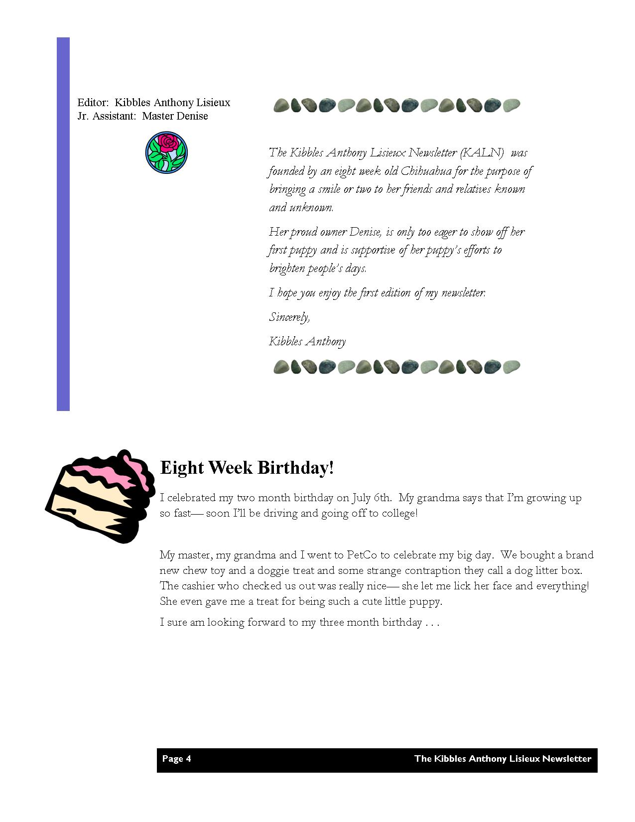 Recently, I managed to recover an old hard drive where Kibbles’ newsletters and baby photos were stored. It is a treasure trove and I thought today, May 15, 2016 – the 1 year anniversary of Kibbles’ passing away, would be the best date to share her very first newsletter. You’ll have to get creative to view the images. We created the newsletter in Microsoft Publisher. For this post I converted each page to a jpg. You’ll need to click on each image to enlarge them. (You may need to click on the image TWICE or zoom in to read the content). I opted not to do any editing (typos abound, but she was still a young puppy, learning how to write).
