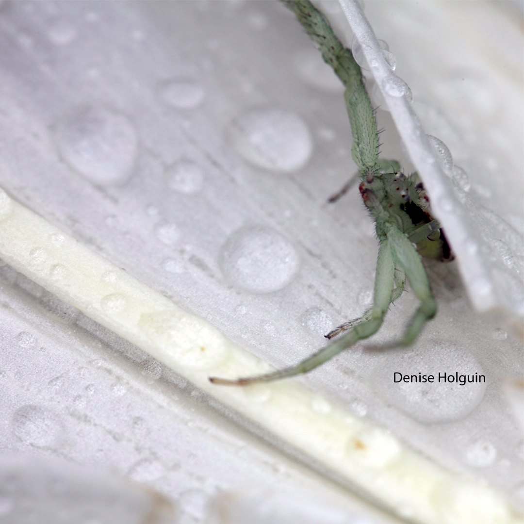 I took this photo after a thunderstorm this week. I planned on focusing on the flower and water droplets but then I spotted the spider.