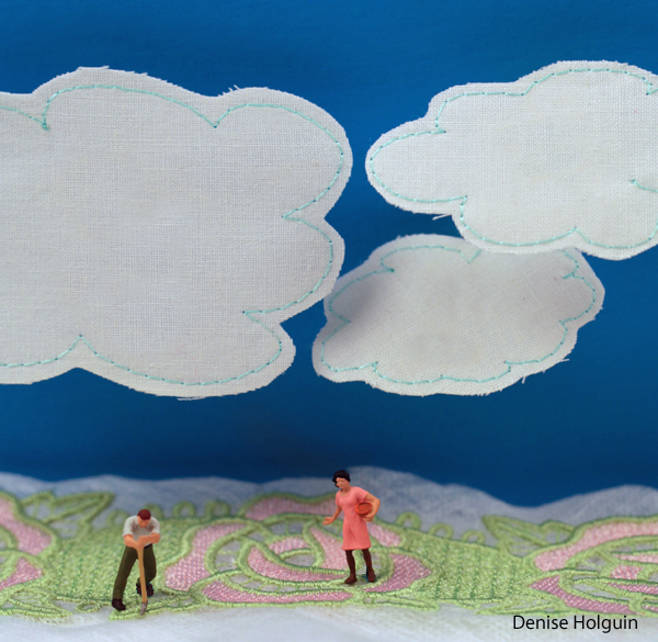 About the photo: I drew clouds on paper then digitized them in embroidery software. Very simplistic but that was the effect I wanted. The green/pink embroidery was a test stitch-out meant to represent a field.