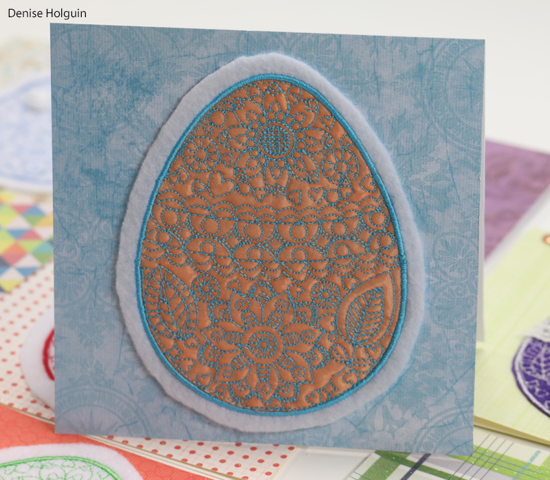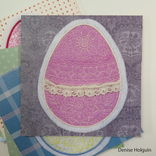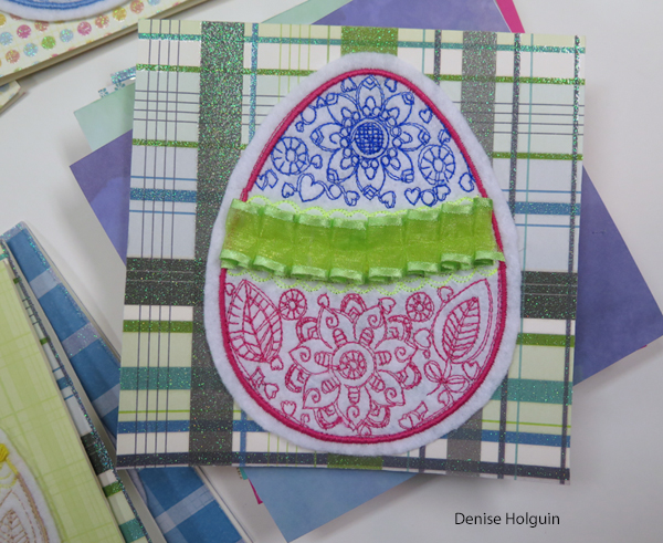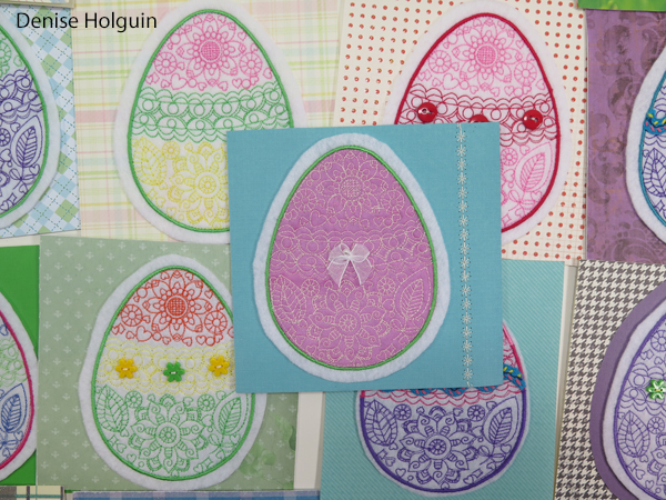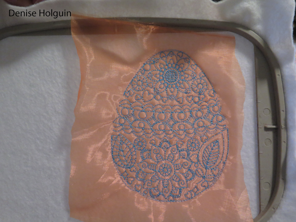 The pink egg below was an experiment. The embroidery design is not meant to be an applique. But I had to prove it could be done. I used an obnoxious sheer fabric that was not easy to work with. The ribbon was placed strategically to cover up a mistake that happened while stitching. Pretty sneaky.