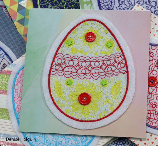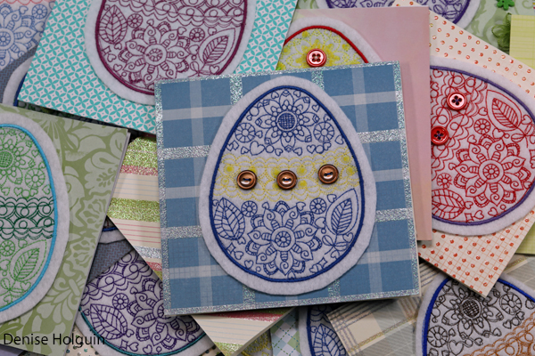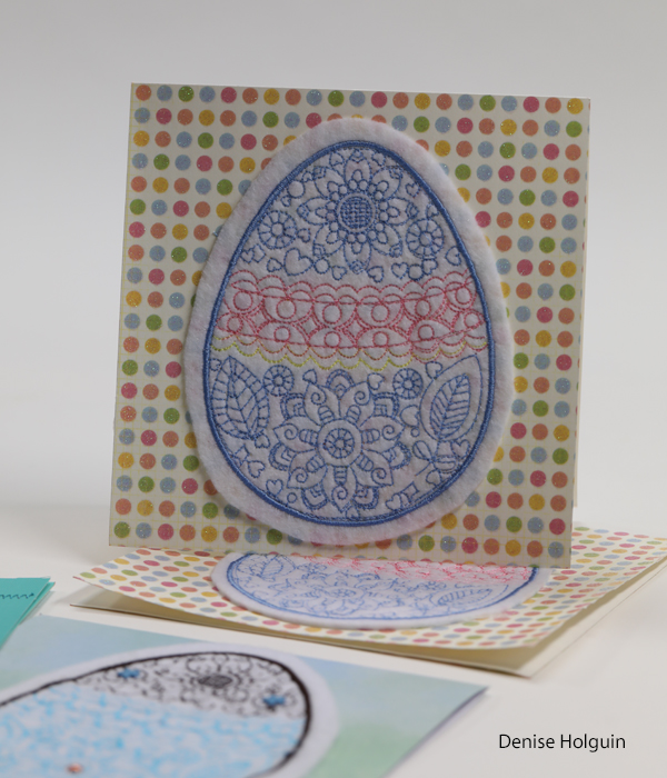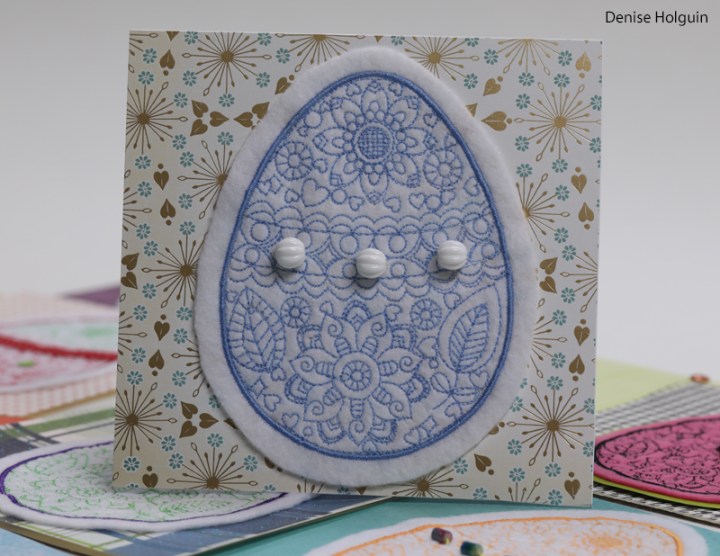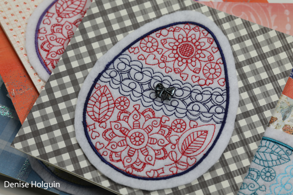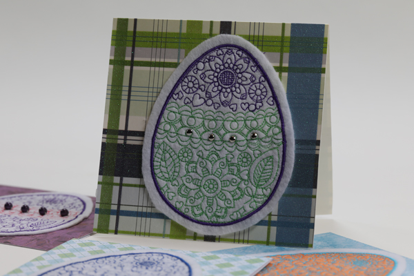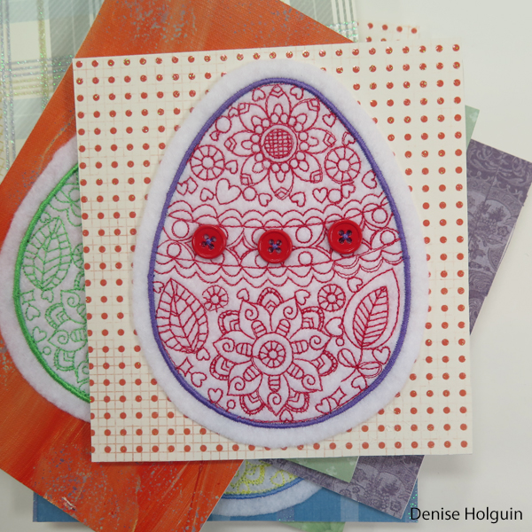 The card below is one of my favorites. Polka dots! The purple thread used to attach the buttons coordinates with the outline of the embroidered egg. Because details matter! 😉