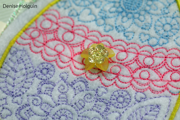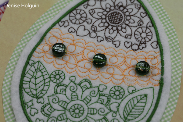 This was the last Easter egg I embroidered. Once this egg was finished, I was completely out of felt. I used a fabric marker to color in some of the embroidered details and added buttons and flower brads. I was determined to make sure the last egg received as much attention as the others.