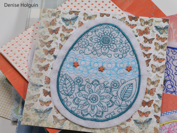 This is the only card among the 100 that has the butterfly card stock. It was a challenge to find embroidered Easter eggs that would coordinate. Fortunately, this egg has similar colors. I added miniature flower brads to help tie everything together.