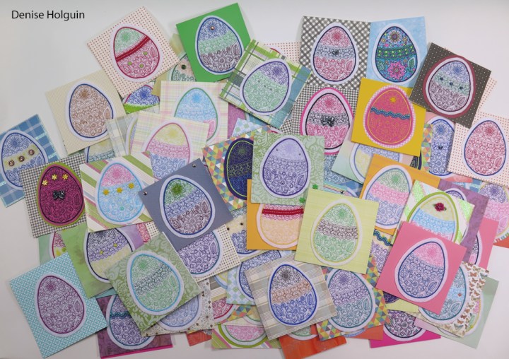 Things were going well until Thursday, April 6th. I fell asleep on the sofa while the embroidery machine was stitching. When I woke up the next morning I hoped fairies finished stitching. They did not. I used the morning to meet my production quota so I’d stay on track. I even timed my shower so I’d finish before the embroidery machine finished stitching an egg.