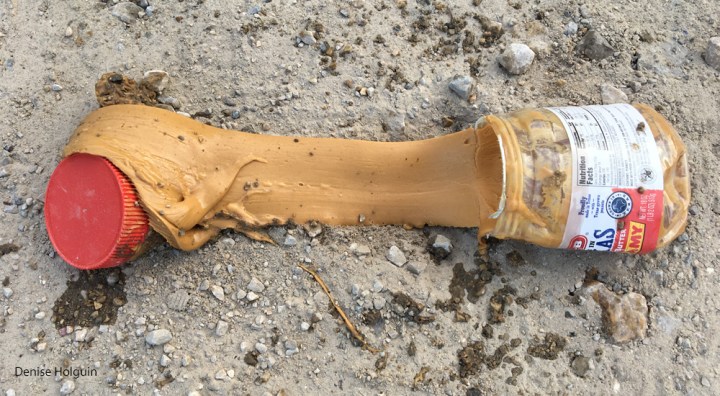 I put on a brave face when I approached this mess. I’m the last person on this planet that wants to handle other people’s trash – especially ooey gooey peanut butter. On the bright side, the portion nearest the can was a little dry. I was able to fold the mess somewhat neatly into the trash. Thank God.