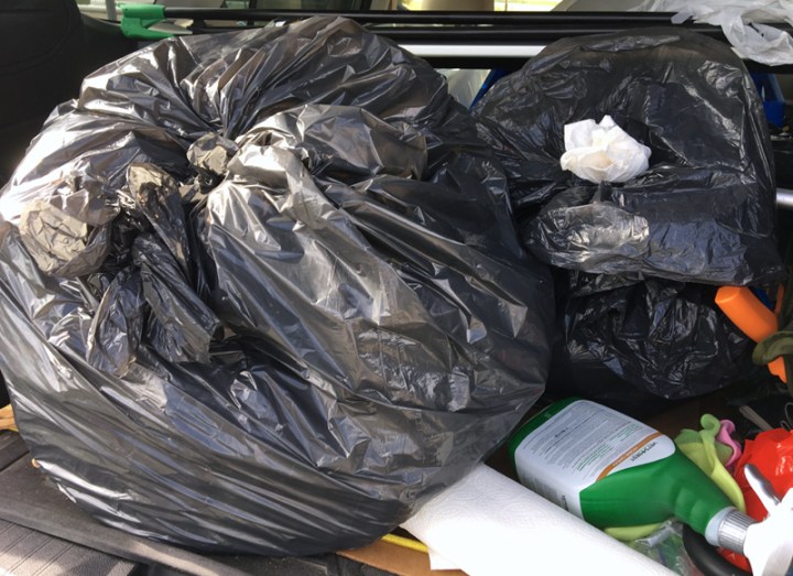 Here are the two very large and heavy bags of trash we collected. The trash gets dropped off at the dumpster at the work station. (All our tools, including our gloves and trash bin get sprayed with disinfectant.)