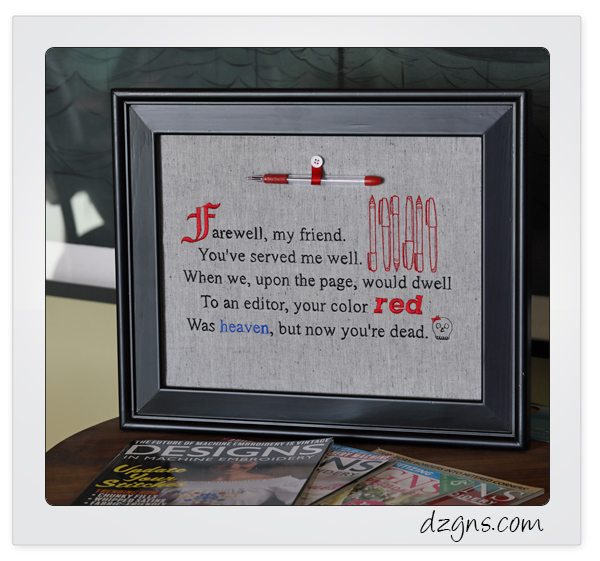 I took screenshots to show the step-by-step process, wrote the how-to article, framed the fabric and photographed it at the office. Not surprisingly, I still had the dead pen safely stored away to display it on my ‘art piece’.