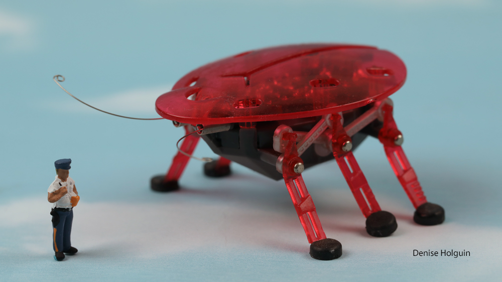 Dr. Rip M 2Shreds maintained an underground social media following where she expounded on the merits of robotic insects. Most thought she was a harmless kook but in retrospect, all the warning signs were there. The photo below shows Detective Solomon uncovering a very alarming looking creature.