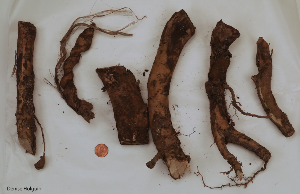 An assortment of the root system cut out of the ground. Notice the second sample has a spiral effect caused by twine that was entangled in the root.
