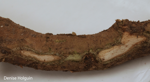 I took a close-up of the last root shown in the group photo. It was dug up several weeks after the bush was removed. It’s still green.