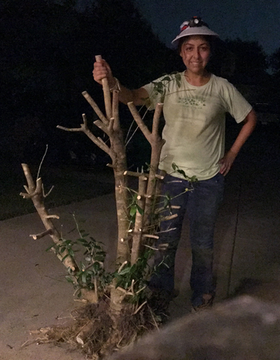 I considered giving up or at least trying another day. But I can’t give up. I put my head flashlight on. Yes, neighbors, I am that person that removes stubborn bushes at night.