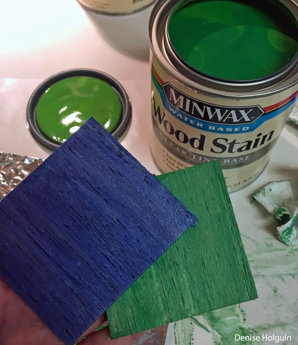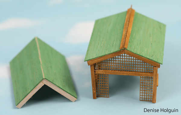 I used balsa wood for the rest of the structure, including the roof. The roof is stained green using Minwax Wood Stain. (the product also comes in blue!) The photo below shows some early experiments.