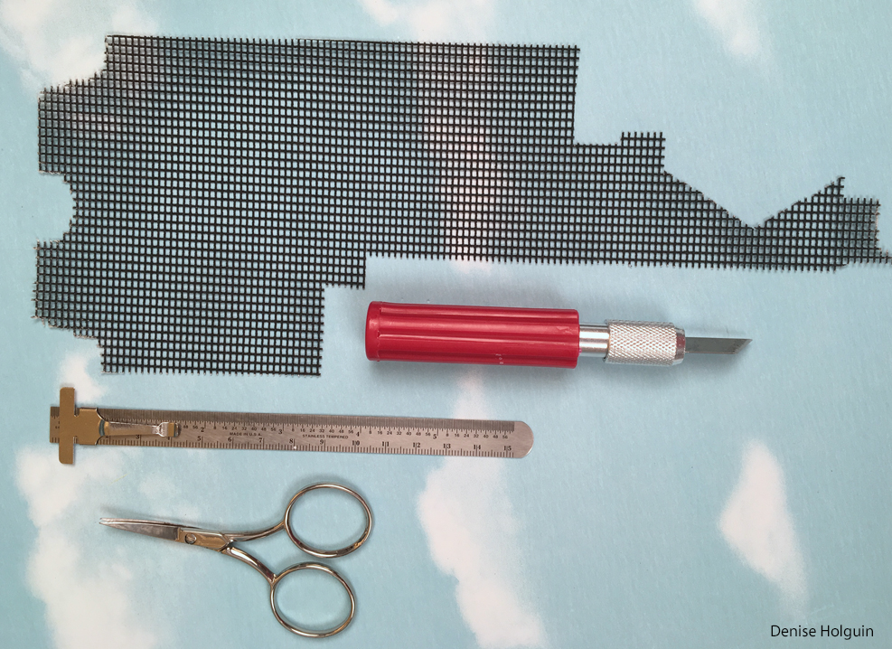 The inspiration was a piece of drywall sanding screen from a local hardware store. It’s sold by the sheet and is affordable. I sacrificed old embroidery scissors for some of the trimming and used a heavy duty knife available at hobby stores.
