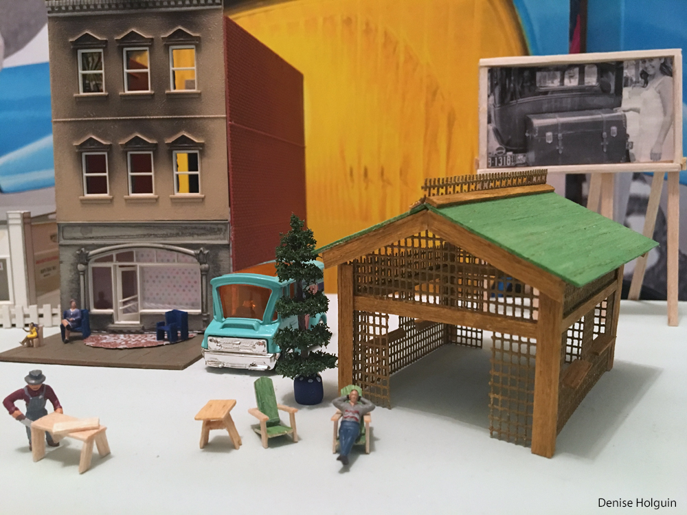 Here’s a look at the structure decked out with props: Adirondack chairs, inhabitants, an over-sized van and an interesting billboard in the background. 😉