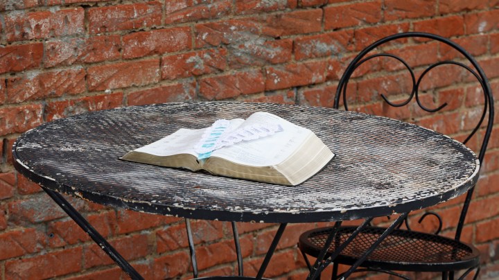 I asked my friend Tore to take me to historic downtown McKinney. He didn’t know why but figured I had a plan. (I didn’t). I just knew I wanted to photograph bookmarks in a special way. I spotted a bistro table and chairs by a nice textured brick building.