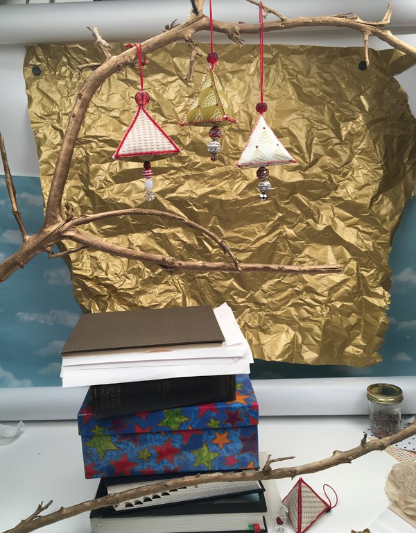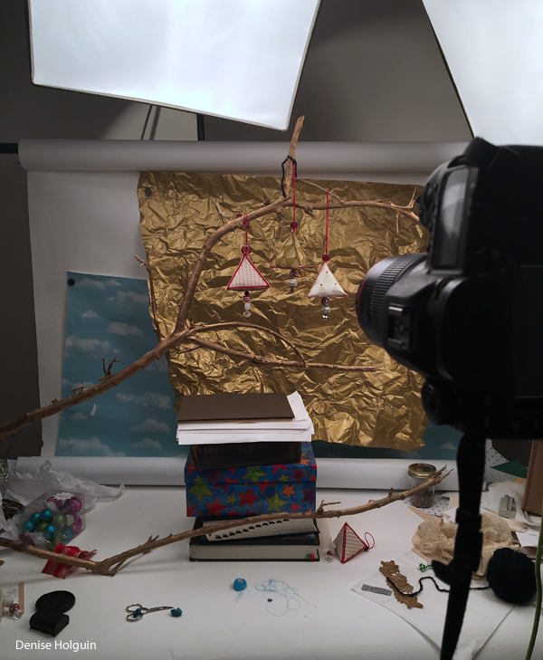 I immediately thought of my giant branch. I agreed to photograph the ornaments.