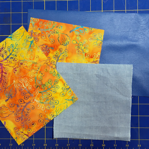 He cut the vinyl fabric for the notebook cover, the batiks for the inside pockets and the blue ‘denim’ for the inside cover.