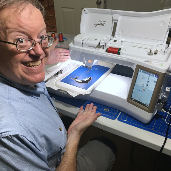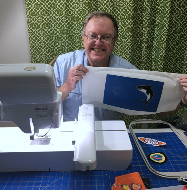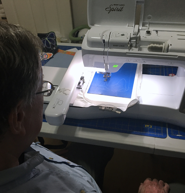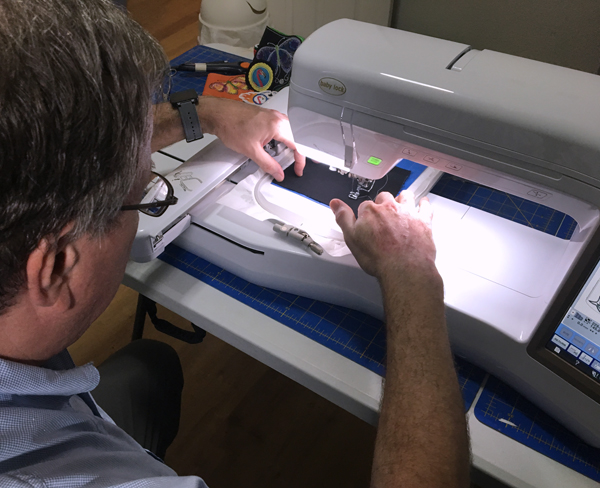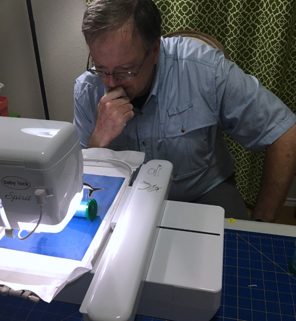 He heard the celebratory chime on the Baby Lock that proclaims the design is finished. I pointed out the smiley face on the touch screen of the machine that also indicates the design is complete. (Even though I’ve been embroidering for a few years, I never tire of those features!).