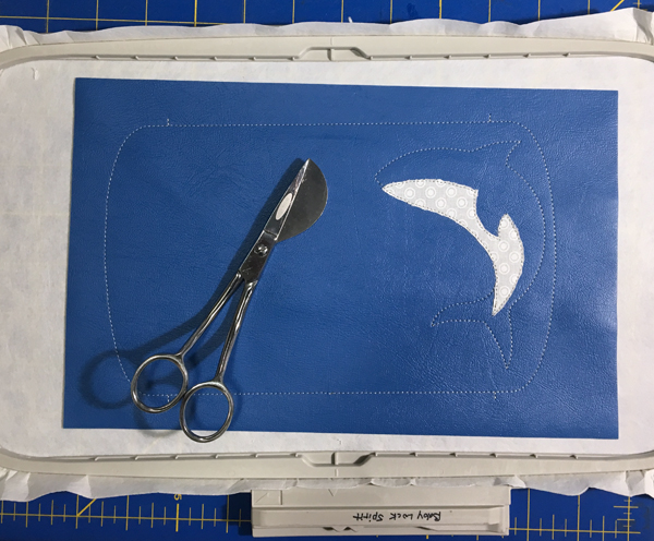 I demonstrated how to use the scissors and suggested he compare them to using regular scissors. But without trying them he could already see the advantage of appliqué scissors. He carefully trimmed the excess appliqué fabric and carefully returned the hoop to the machine.