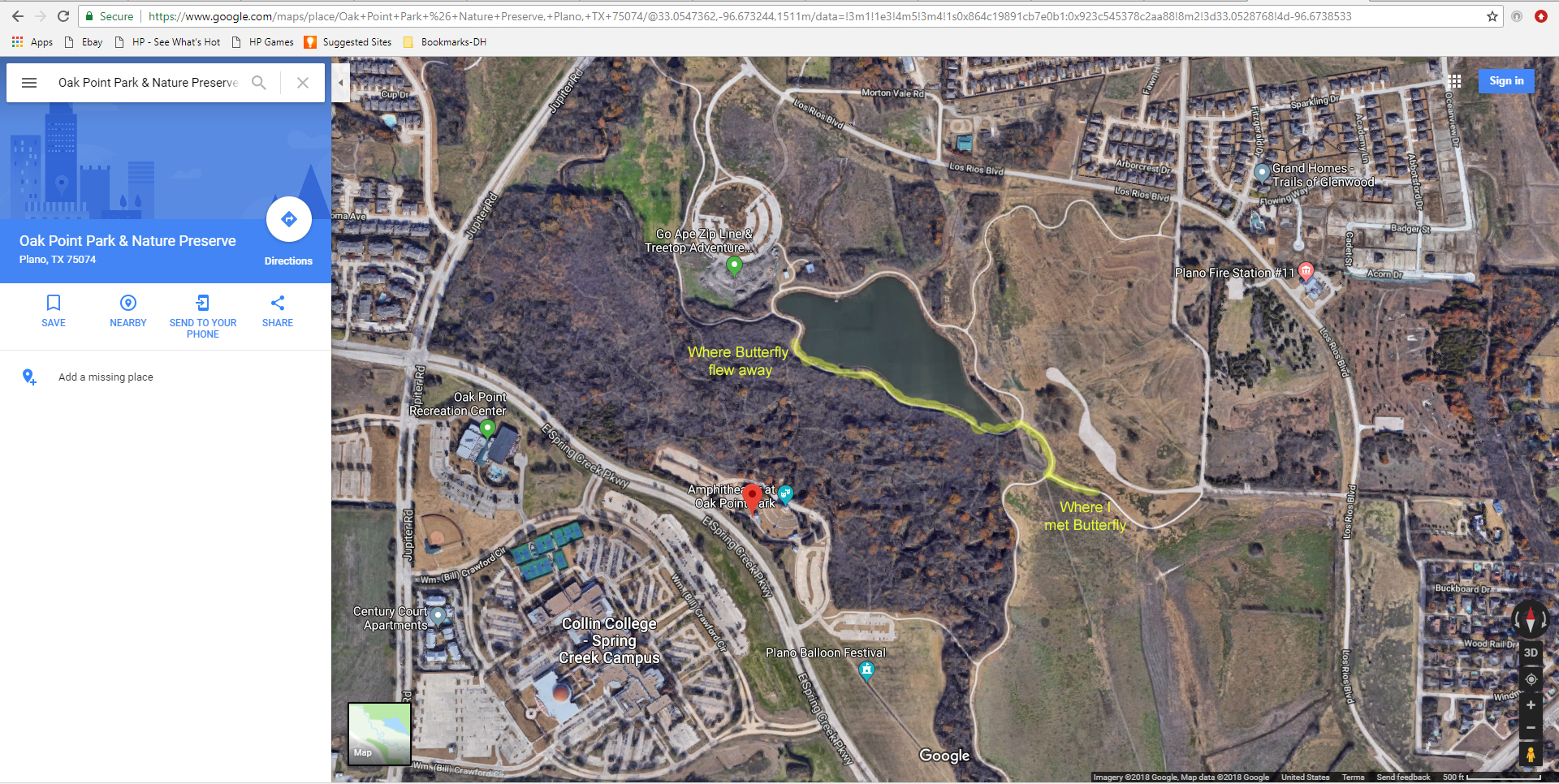 Here is a map courtesy of Google Maps that shows the park. I marked the trail I walked with Butter to give you perspective of how crazy it was to have a butterfly hitch a ride on me. (Click the image to see larger view)