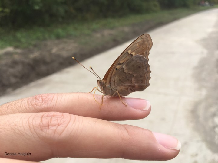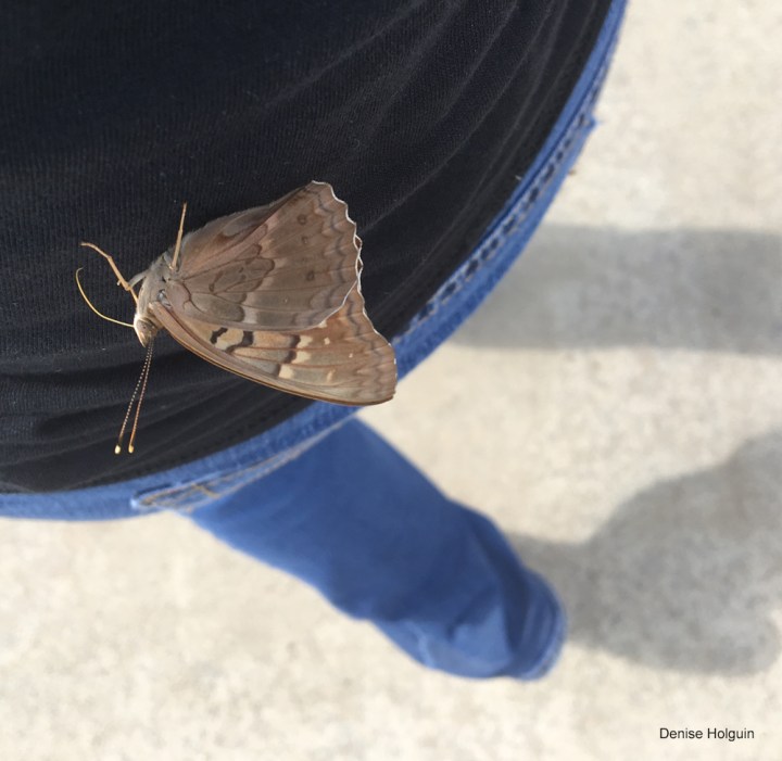 I turned to head back to the main trail. But we noticed a butterfly landed on me. I was able to twist enough to see it on my lower back— near my waist. We took some photos. The butterfly remained.