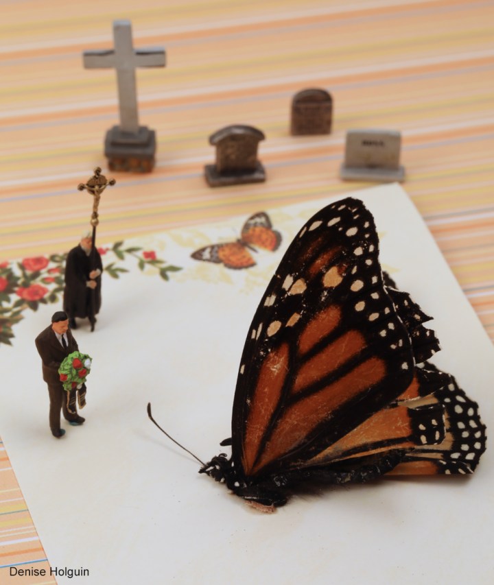 Notes: As I pulled in to the parking lot at work, I noticed the butterfly at our circle drive. I parked my car and my coworker Kathy kept an eye on me as I retrieved the butterfly body. (I have acquired lots of mourners and tombstones for these very occasions.)