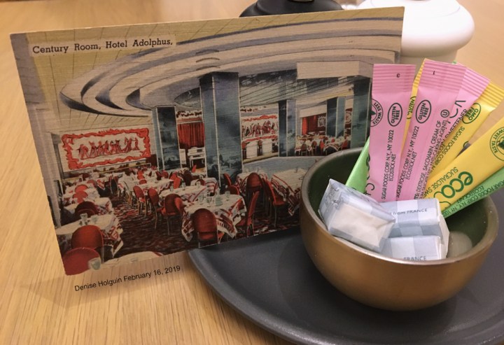 Below are two postcards I acquired. The lower postcard shows the Century Room, which had a retractable dance floor with an ice rink. It was the place to be. The top postcard shows the street view outside of the Adolphus Hotel. I love the cars and the old signs for the hotel.