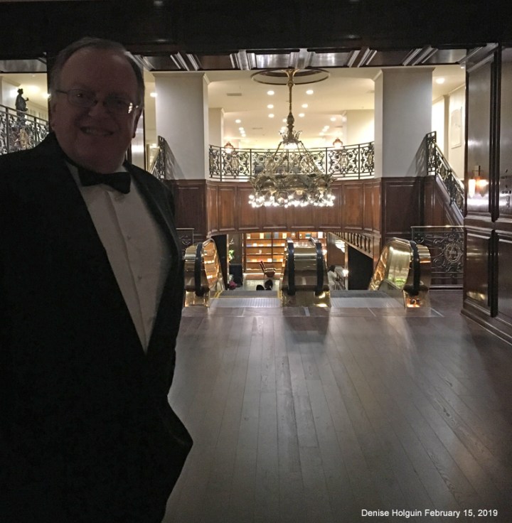 The photo below highlights the grandeur of the chandelier, the ironwork and even the elegant gold escalators. If you go up one floor it leads to a possible spot where one might discreetly dance a foxtrot. I could be mistaken but the look on Tore’s face says, “shall we dance?”