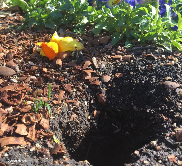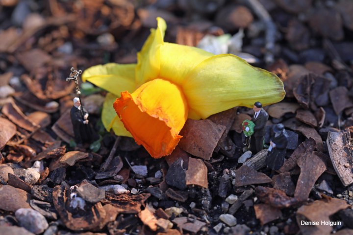 Notes: The moment was just too perfect. I spotted the fallen daffodil in the flowerbed, there was a hole nearby and I had my mourners in my camera bag. Time for a funeral service!
