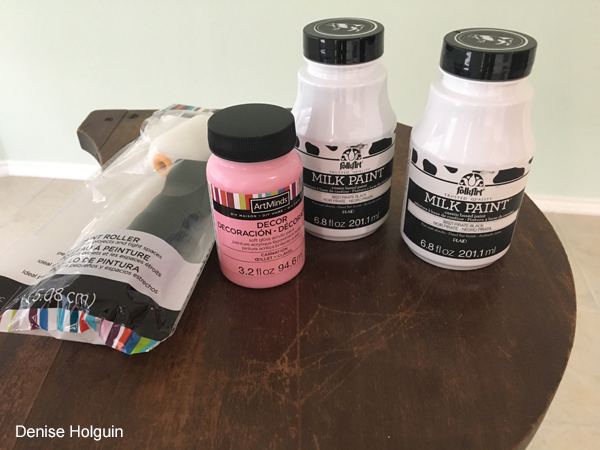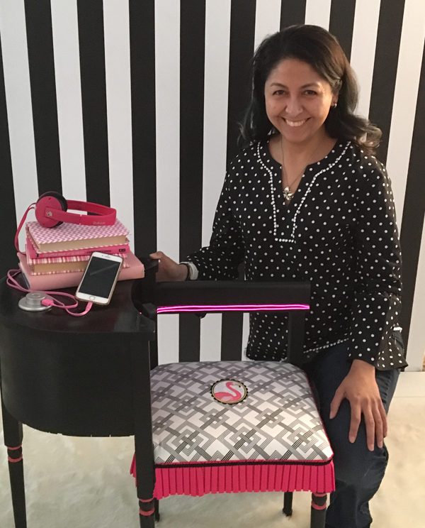 My mom reupholstered the seat with my embroidered flamingo fabric. The seat wasn’t attached until after repainting the table and adding a glossy finish.