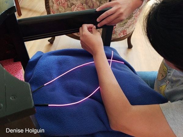 The photo shows me figuring out how to attach the EL wire to wood. Not an easy proposition.