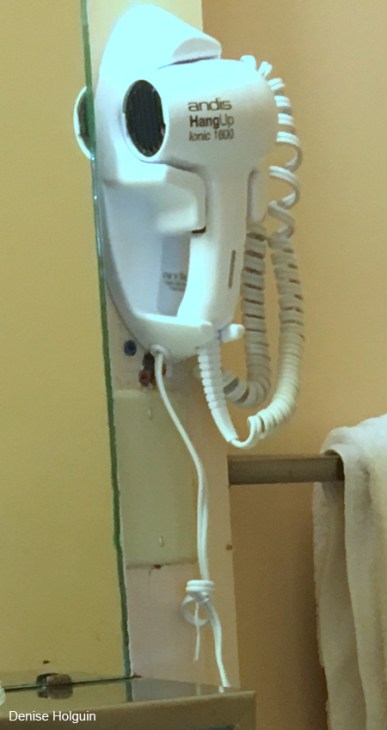 There was a hairdryer installed on the wall. There were several attempts made to install it, as there were multiple holes, and electrical covers. These elements suggest there is no sense of pride in caring for this hotel. It was very sad.
