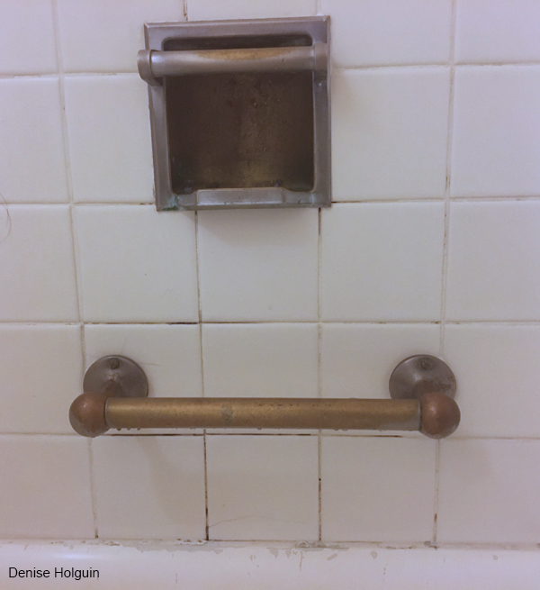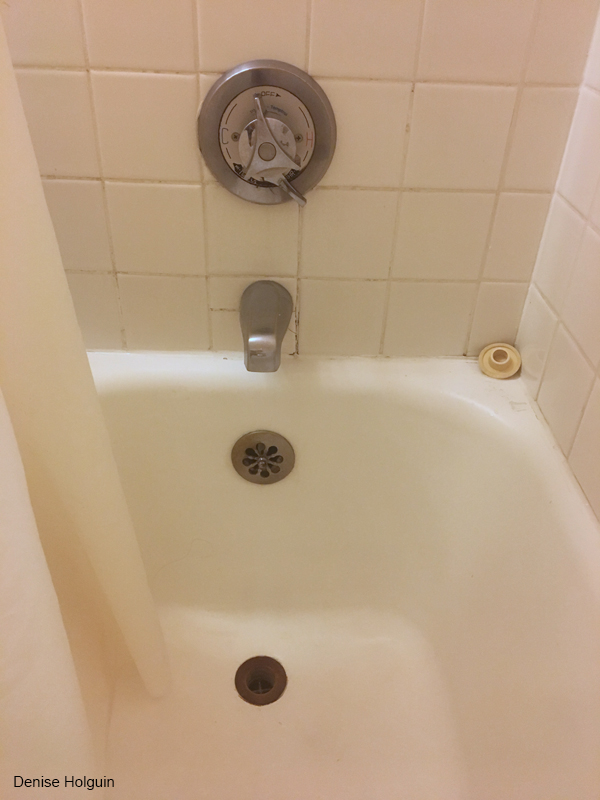 This room had an old tub which was better than my previous living conditions. Everything about the room was still outdated and dirty but it was quiet. The carpet was stained and buckling.