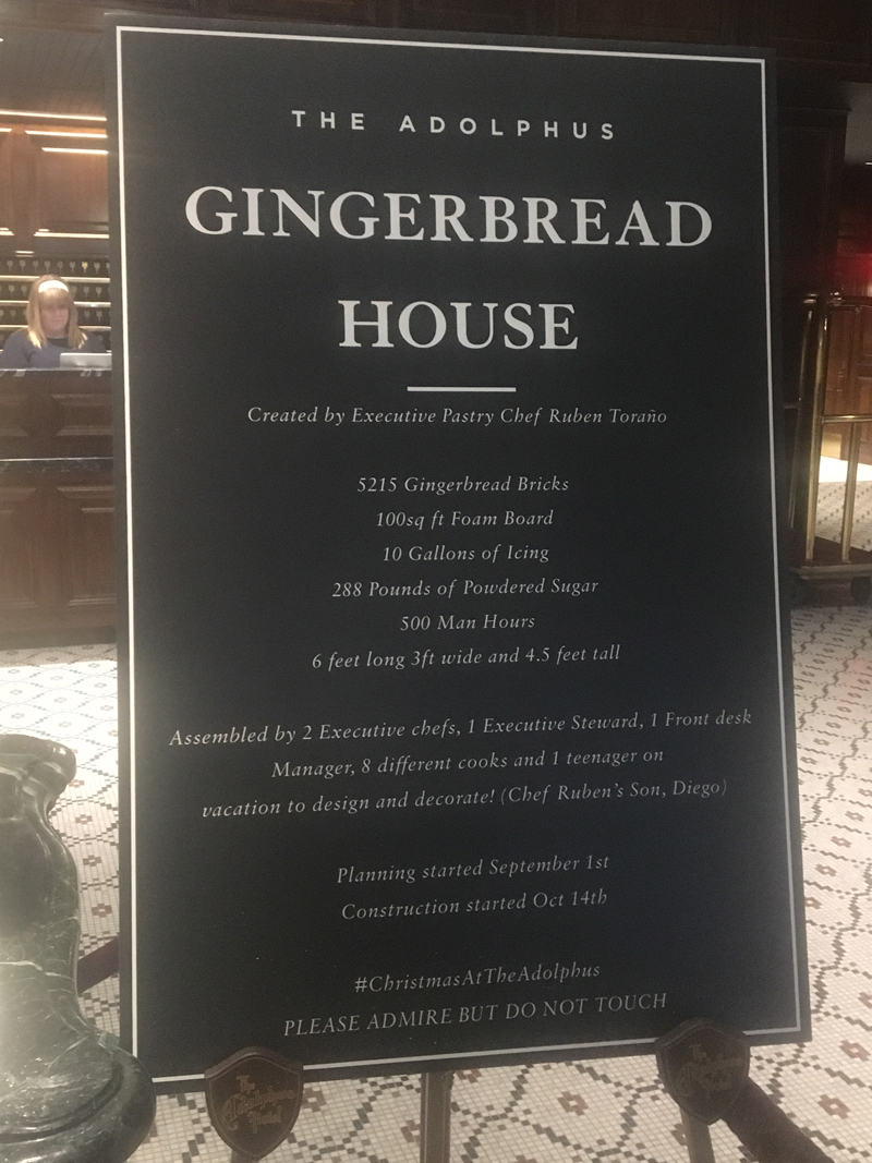 Tore’s reply: “Let’s go to The Adolphus to see the gingerbread display!”
