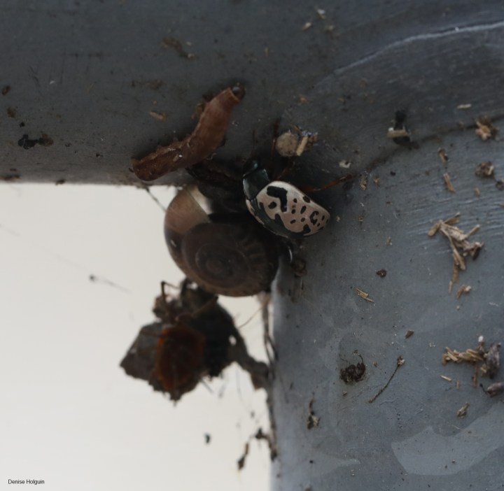 When I approached the debris-laden area, I was surprised to discover the number of critters hanging on for dear life. There were snails, beetles, ground spiders, stink bugs, web building spiders, ants and various other creatures.