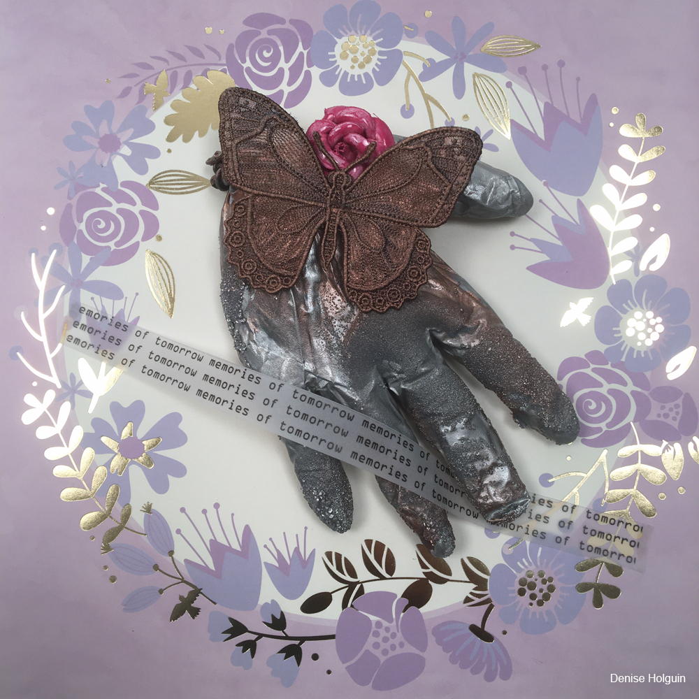 I spray painted an embroidered butterfly. The silk flower was a pale pink which I spray painted bright pink for a more cheerful effect.