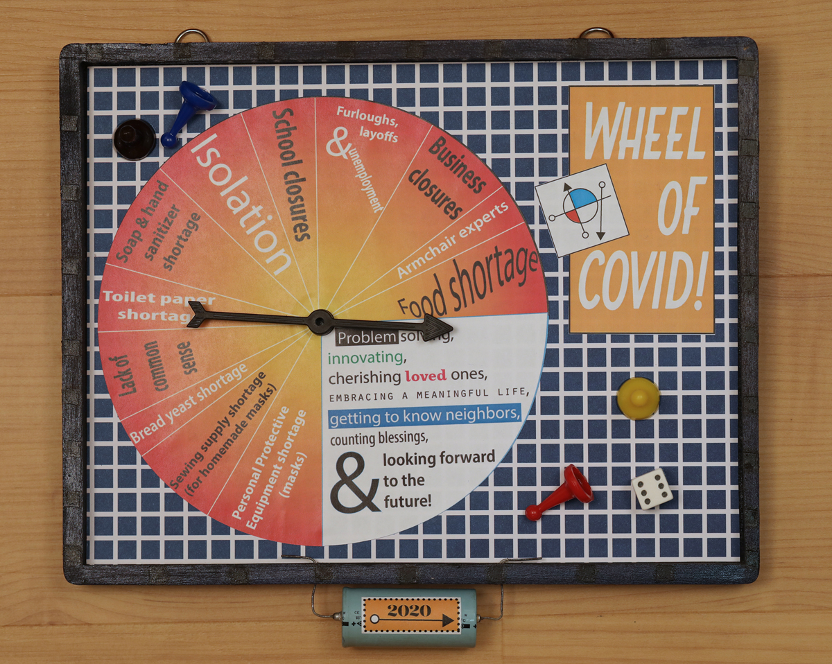 2. I was inspired by a board game I found in my attic. I decided to make my own version of a spinner, incorporating events from 2020. It was important that I include a Dale Carnegie type of message, so I included positive elements that have occurred in 2020. I also intentionally made the positive portion of the ‘pie’ larger.