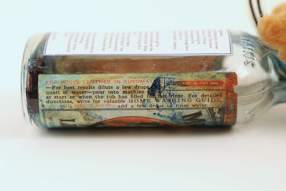 I purchased the jar in all its glory – the label is stained with the liquid bluing and you can see residue inside the jar. There is also half a piece of cork stuck in the opening of the bottle. I planned on cleaning it but it’s too charming to change. Normally I must clean everything but given the substance was a cleaning product, I made an exception.