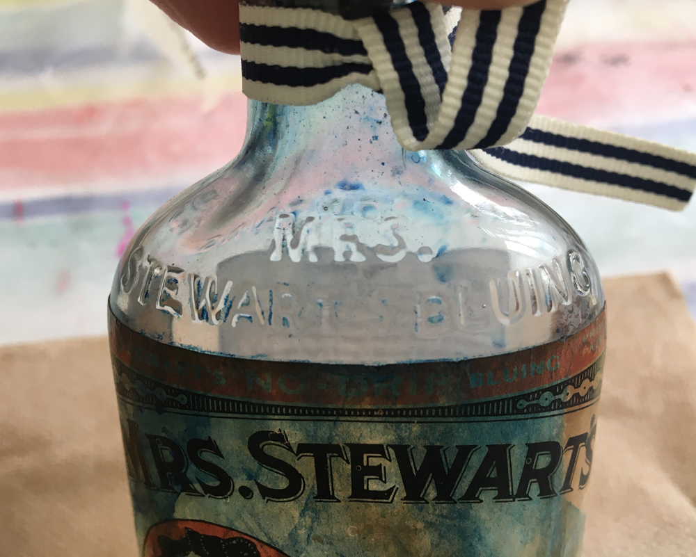 If you like history, please visit the Mrs. Stewart’s Liquid Bluing website. The page highlights interesting features that you’ll find on the bottle, including the cork and the embossed lettering. Mrs Stewart’s Liquid Bluing.