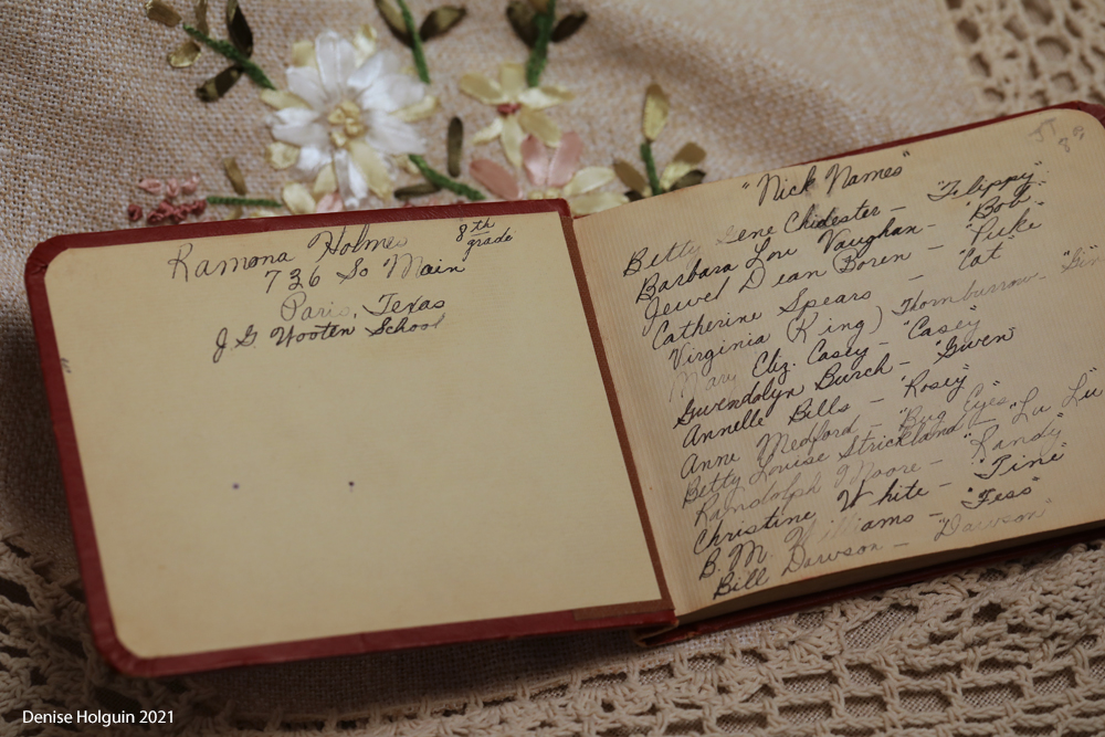 I recently went to my favorite antique store in Dallas (Curiosities) to purchase an autograph book from the 1800s. But by the time I arrived the book was sold. Since it’s a long drive – I made the trip worthwhile. I scoured the store and found a consolation purchase that ended up being an even better gem. This little red autograph book belonged to 8th grader Ramona Holmes, a student at J. G. Wooten School, in Paris, Texas. The autograph book is dated 1946.