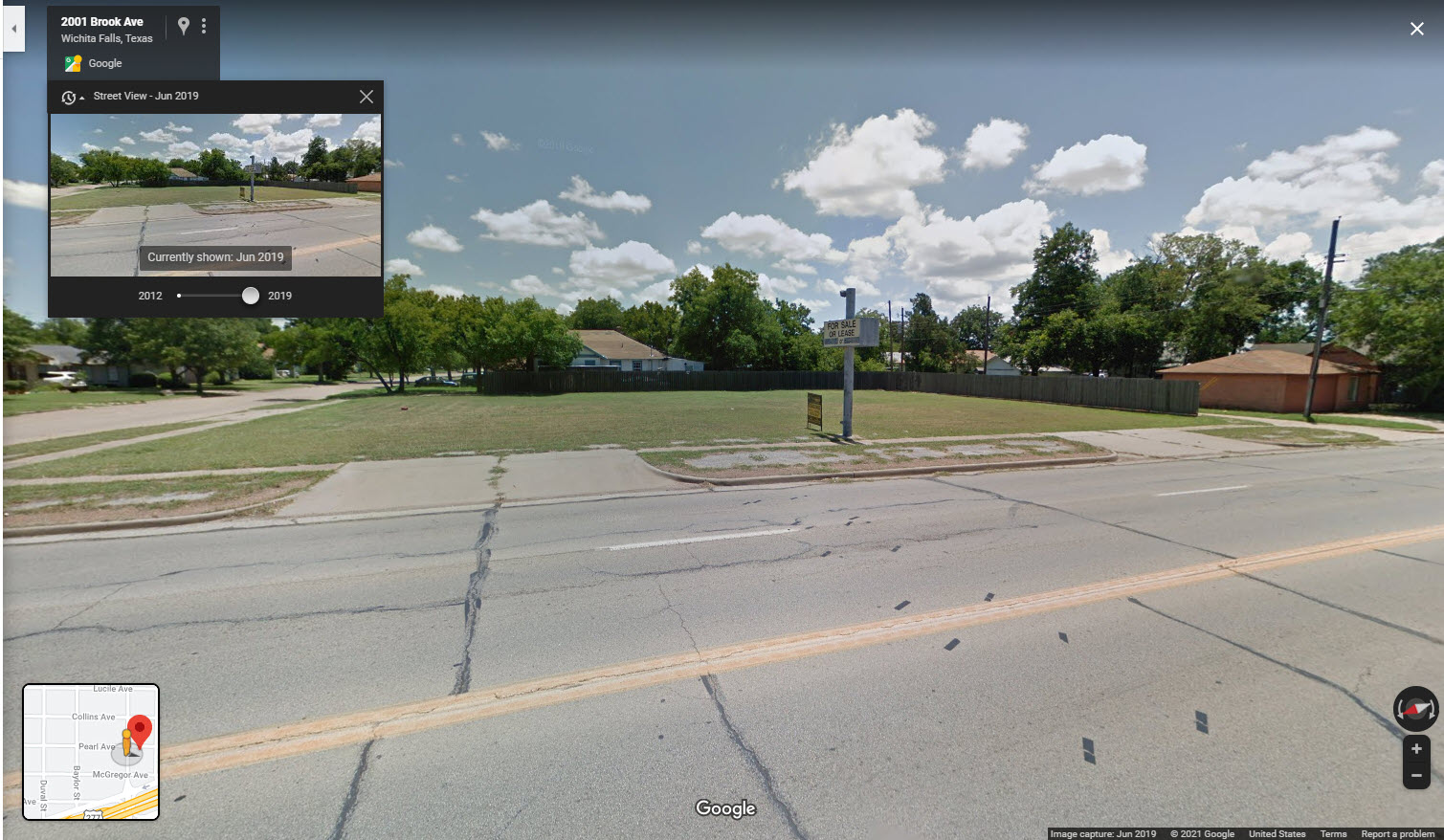 I contacted the local government offices in Wichita Falls to find out when the home was demolished. The information they have is that it was demolished in 2003 by the property owners and the new address is 2001 Brook Ave. The new address makes sense because the lot has evidence of 3 driveways and it is on the corner of a street. See the image from Google Maps below, the view is from Brook Ave, dated June 2019.
