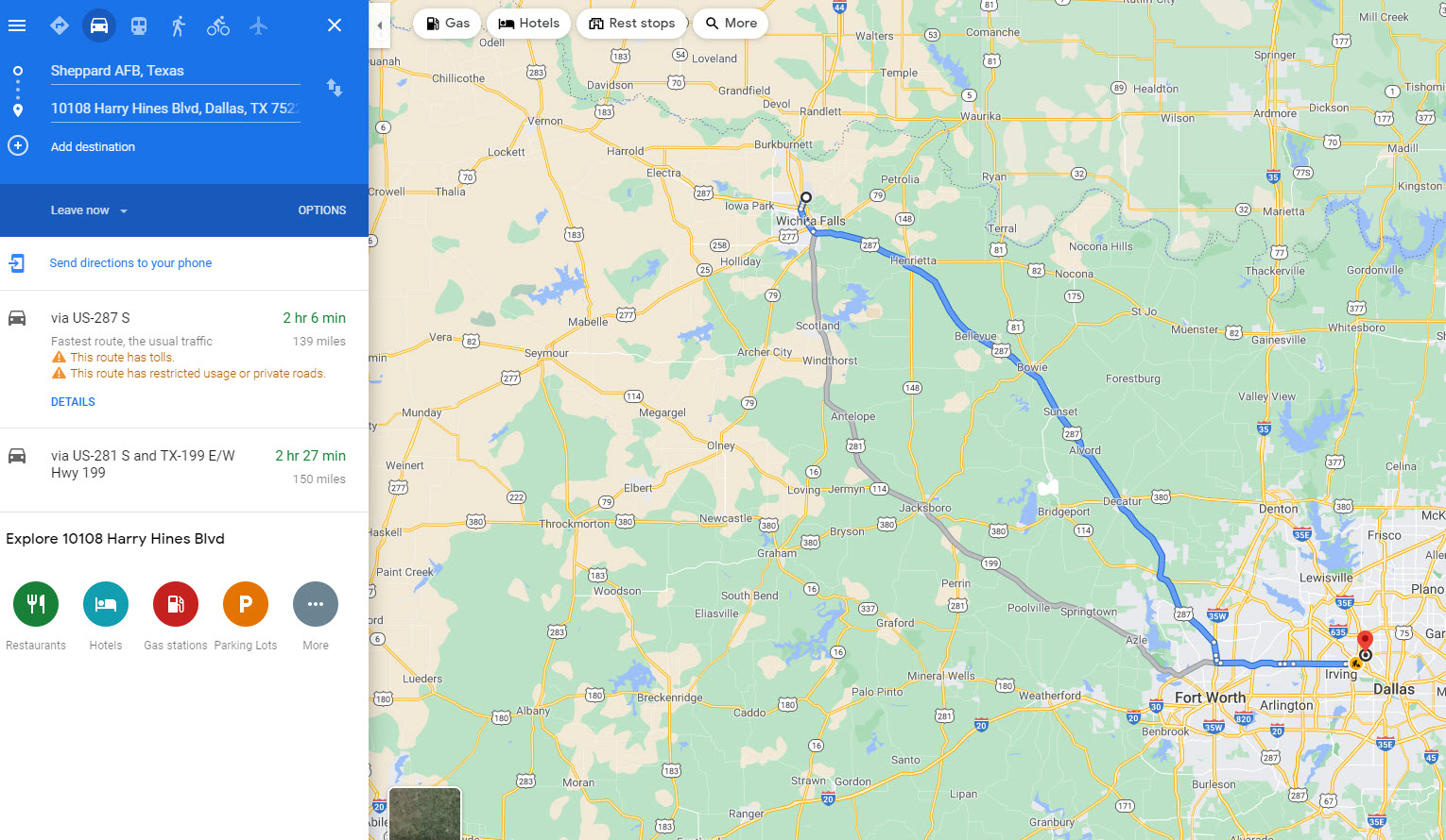 I used Google Maps to route the modern-day journey from the Air Force Base to the Tower Hotel Courts. Today the drive would take a minimum of 2 hours with toll fees or 2 1/2 hours without fees. See the Google Maps image below.